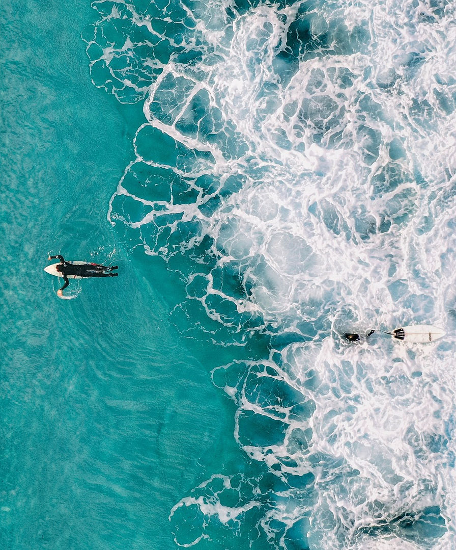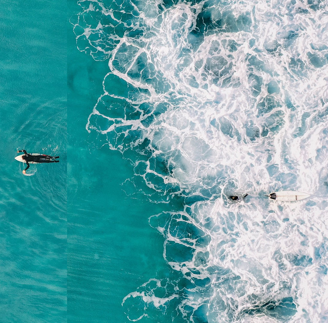 An overhead view of a surfer prominently visible in the middle of a calm ocean, with turbulent waves behind them on the right. Credit goes to Kiril Dobrev on Pixabay.